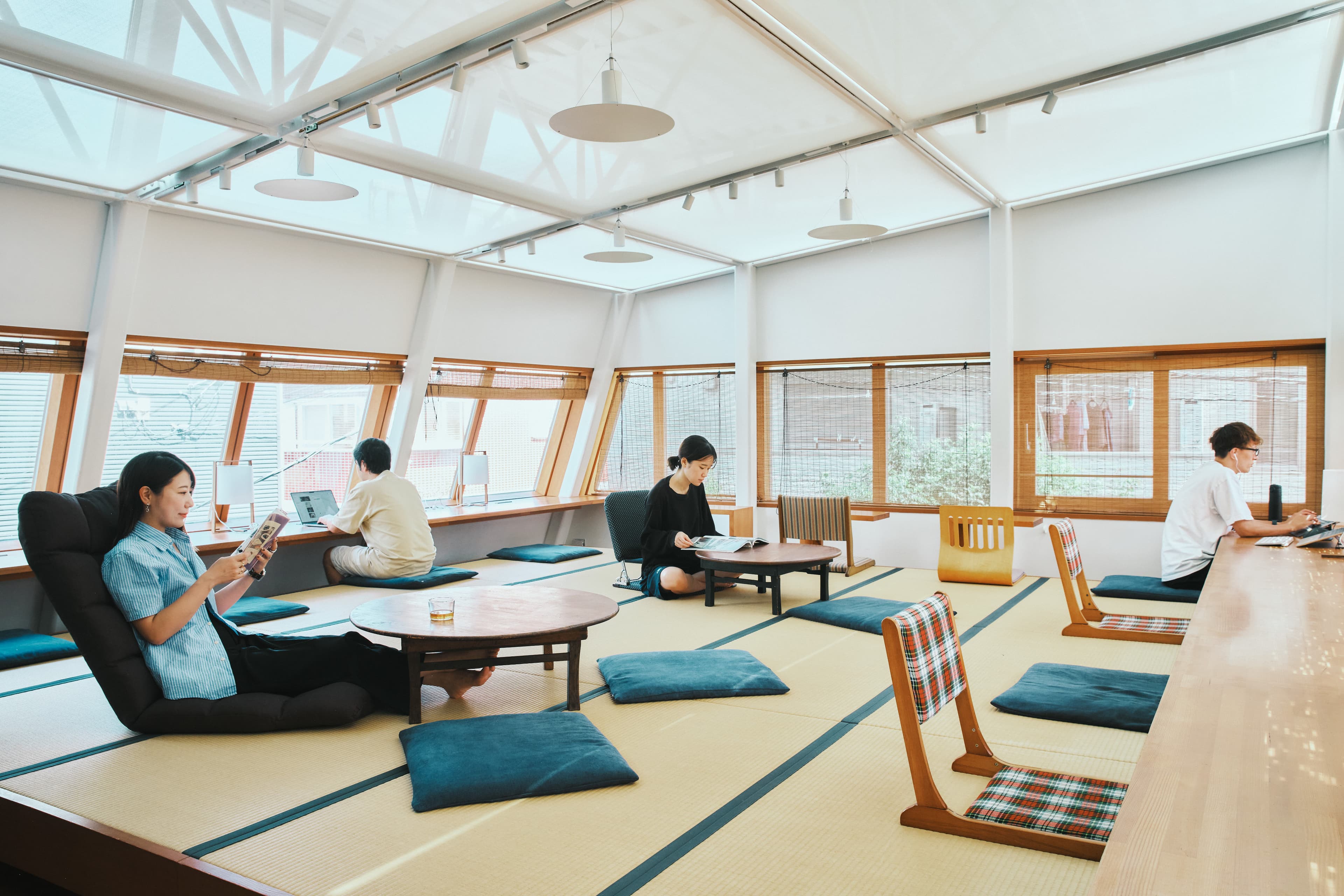 畳のワークスペースで、仕事や読書に集中できます。疲れたら寝そべってひと休み。Wi-Fi・電源・プリンターの他、本棚も充実しています。