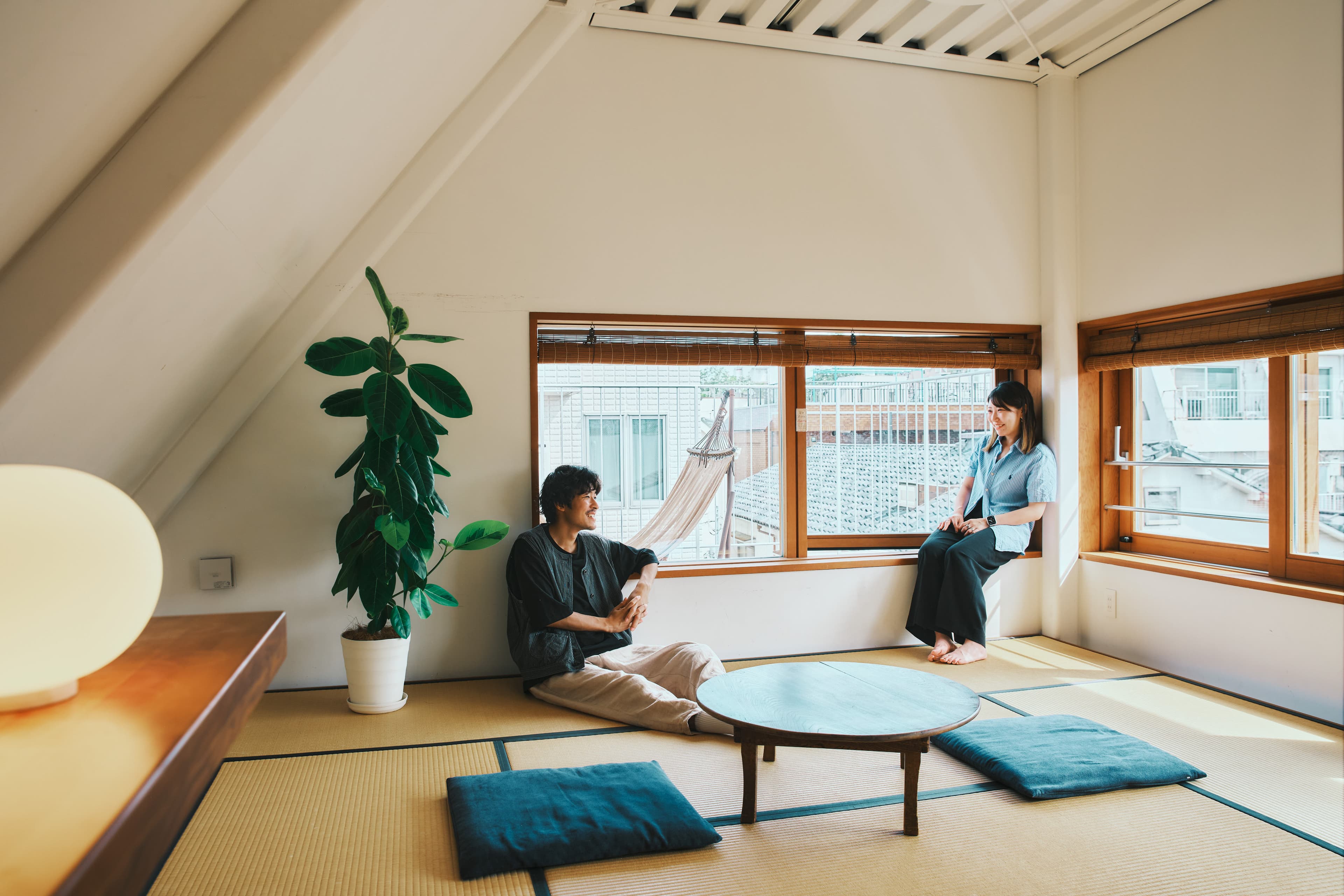 六畳一間を貸切利用できます。オンライン会議をするもよし、昼寝をするもよし。ベランダからは、銭湯越しに富士山や夕日が見えます。